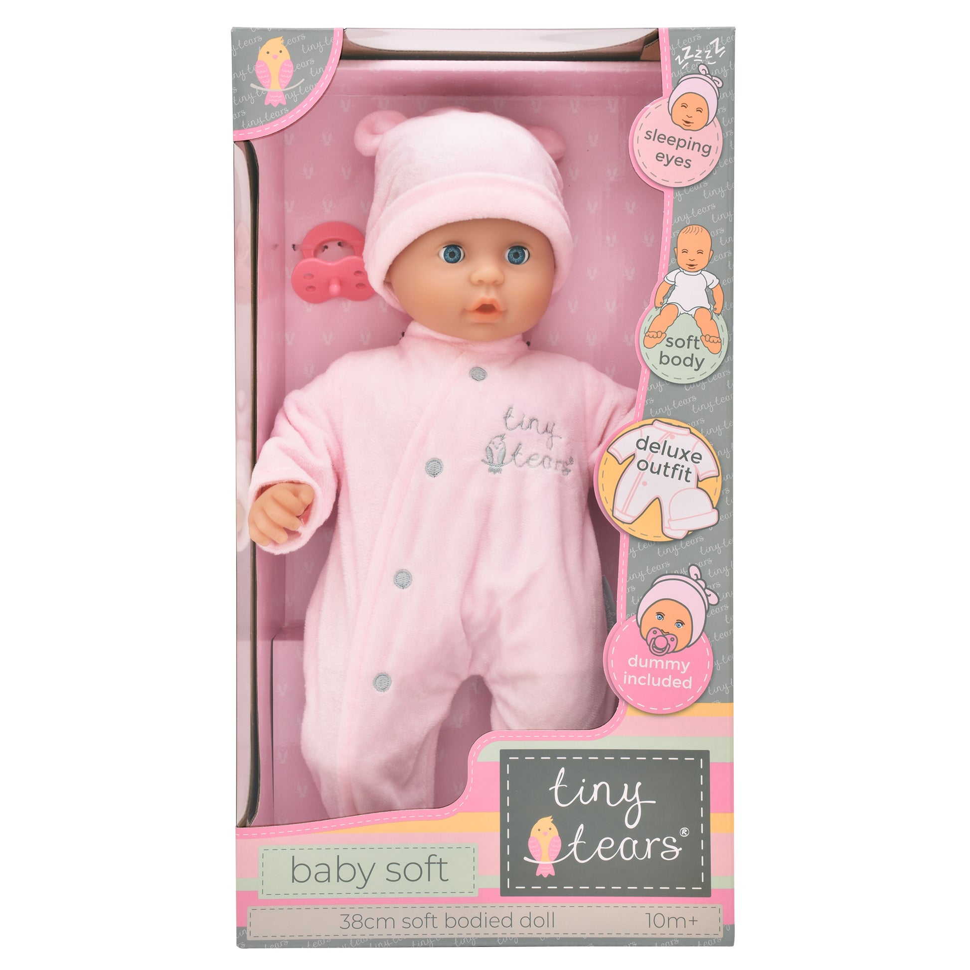 The Baby Soft Doll is a 38cm soft bodied doll and features a deluxe soft pink outfit. Little ones can snuggle up to their Tiny Tears doll and give them lots of love and attention, just like you would with a real baby.